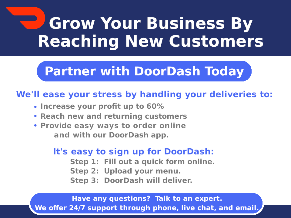 Strategy: Persuade restaurant owners to become a partner of DoorDash by highlighting how reaching new customers could grow their business. Overcome their skepticism of new technology by letting them know the sign up process is easy and that DoorDash will provide 24/7 support.